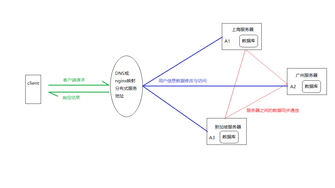 要達到數據一致性的要求,必須在上海服務器修改數據的同時,同步廣州和新加坡的數據庫,並且在數據同步完成之前,訪問廣州和新加坡的數據庫中這條數據需要等待,返回同步后的結果(一致性)。