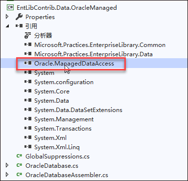 上面使用了兩種方式,一種是官方擴展的EntLibContrib.Data.OdpNet方式,一種是我們這裏剛剛出爐的 EntLibContrib.Data.OracleManaged方式,完整的數據庫支持文件信息如下所示。