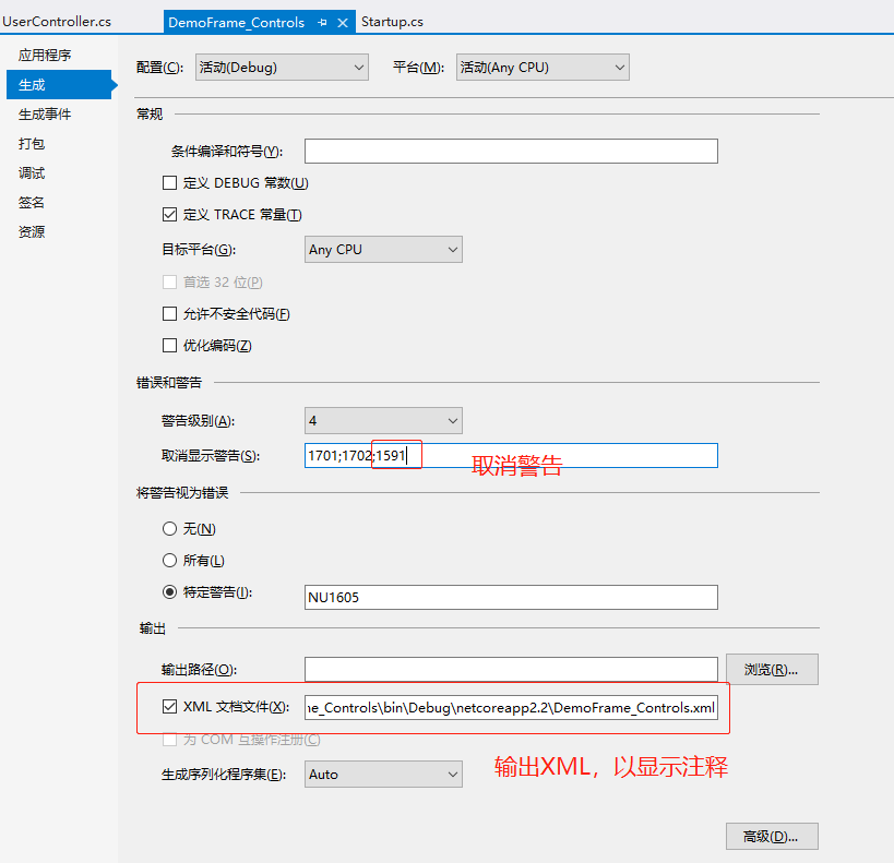 這個時候在需要輸出註釋的控制器類庫的屬性 中設置如下信息,並添加上相關註釋
