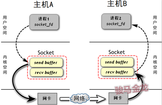 所以,服務端和客戶端通過兩個套接字通信就簡單了,一端向send buffer寫數據,該buffer的數據會通過已經建立好的TCP連接發送到另一端的recv buffer,於是另一端只需從recv buffer中讀數據即可實現不同計算機上的進程間通信。過程如圖。