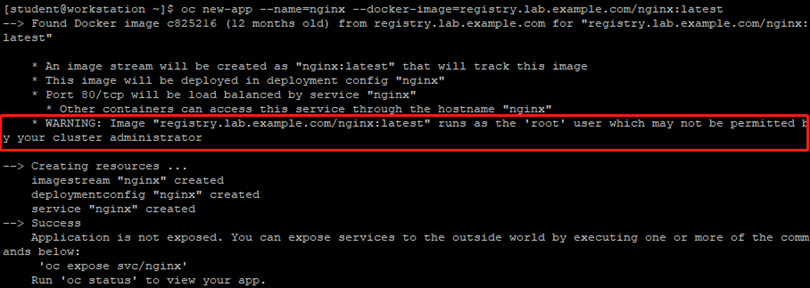 結論:該命令會發出警告,提示需要root特權。默認情況下,OpenShift不支持使用操作系統的root用戶運行容器。