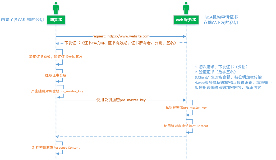 ③ 再拋出疑問,怎麼認定下發的公鑰是這個web服務器匹配的密鑰?怎麼確定這個公鑰下發過程沒被截取篡改? 這就是追溯到握手階段的下發證書過程,瀏覽器內置的CA機構認定該證書是其有效下發,並通過簽名認定該證書沒被篡改,最終認定該 證書下發的公鑰是受信web服務器準確下發。