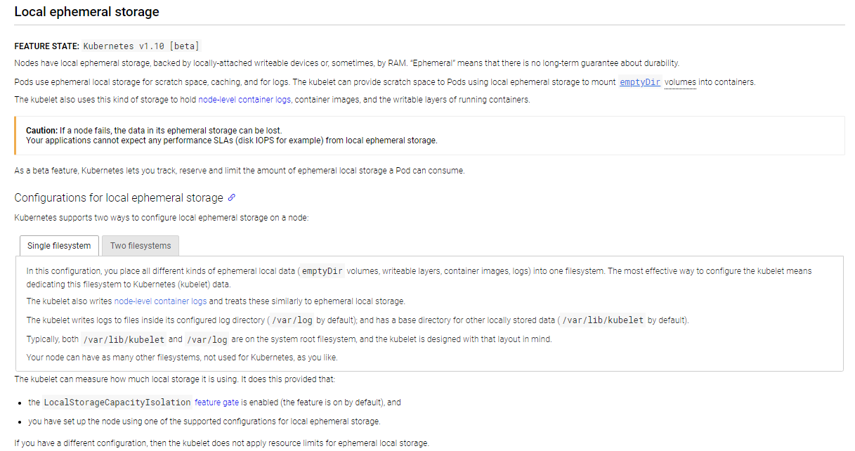 Kubernetes在1.8的版本中引入了一種類似於CPU,RAM的新的資源模式:ephemeral-storage屬性(直譯為臨時存儲),並且在1.10的版本kubelet默認啟用了這個特性。