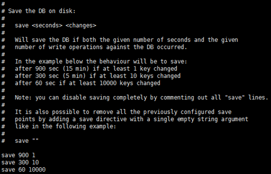 其中save 900 1的含義是:當時間到900秒時,如果redis數據發生了至少1次變化,則執行bgsave;save 300 10和save 60 10000同理。當三個save條件滿足任意一個時,都會引起bgsave的調用.