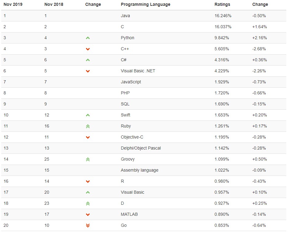 • 對於學校沒有開設,但是自己又想學習的語言而言,該如何去選擇。首先,學校開設的語言基本是市場比較流行的語言,也符合市場需求,所以,完全可以在學校開設的語言中去選擇自己想要了解並學習的語言。此外,我們可以藉助 TIOBE ( TIOBE 編程社區指數是編程語言流行度的指標,該榜單每月更新一次,指數基於全球技術工程師、課程和第三方供應商的數量。包括流行的搜索引擎,如谷歌、必應、雅虎、維基百科、亞馬遜、YouTube 和百度都用於指數計算。 )去了解語言的流行程度,流行程度決定市場需求,以此來參考自己想要了解並學習的語言,在此附上2019年11月語言排名。