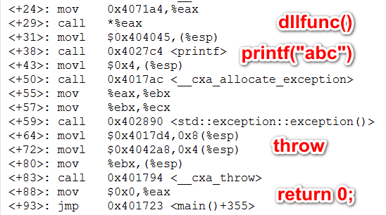 1 function main(): 2 <+0>: lea 0x4(%esp),%ecx 3 <+4>: and $0xfffffff0,%esp 4 <+7>: pushl -0x4(%ecx) 5 <+10>: push %ebp 6 <+11>: mov %esp,%ebp 7 <+13>: push %edi 8 <+14>: push %esi 9 <+15>: push %ebx 10 <+16>: push %ecx 11 <+17>: sub $0x68,%esp 12 <+20>: movl $0x4017ac,-0x44(%ebp) 13 <+27>: movl $0x402958,-0x40(%ebp) 14 <+34>: lea -0x3c(%ebp),%eax 15 <+37>: lea -0x18(%ebp),%ebx 16 <+40>: mov %ebx,(%eax) 17 <+42>: mov $0x4015b4,%edx 18 <+47>: mov %edx,0x4(%eax) 19 <+50>: mov %esp,0x8(%eax) 20 <+53>: lea -0x5c(%ebp),%eax 21 <+56>: mov %eax,(%esp) 22 <+59>: call 0x402790 <_Unwind_SjLj_Register> 23 <+64>: call 0x4018b0 <__main> 24 <+69>: mov 0x406194,%eax 25 <+74>: movl $0xffffffff,-0x58(%ebp) 26 <+81>: call *%eax 27 <+83>: movl $0x404001,(%esp) 28 <+90>: call 0x4027e4 <printf> 29 <+95>: movl $0x4,(%esp) 30 <+102>: call 0x4017cc <__cxa_allocate_exception> 31 <+107>: mov %eax,-0x60(%ebp) 32 <+110>: mov %eax,%ecx 33 <+112>: call 0x4028b0 <std::exception::exception()> 34 <+117>: movl $0x4017f4,0x8(%esp) 35 <+125>: movl $0x404264,0x4(%esp) 36 <+133>: mov -0x60(%ebp),%eax 37 <+136>: mov %eax,(%esp) 38 <+139>: movl $0x1,-0x58(%ebp) 39 <+146>: call 0x4017b4 <__cxa_throw> 40 <+151>: mov $0x0,%eax 41 <+156>: mov %eax,-0x60(%ebp) 42 <+159>: jmp 0x401733 <main()+547> 43 <+164>: lea 0x18(%ebp),%ebp 44 <+167>: mov -0x54(%ebp),%edx 45 <+170>: mov -0x50(%ebp),%ecx 46 <+173>: mov -0x58(%ebp),%eax 47 <+176>: test %eax,%eax 48 <+178>: je 0x4015e6 <main()+214> 49 <+180>: sub $0x1,%eax 50 <+183>: test %eax,%eax 51 <+185>: je 0x40161b <main()+267> 52 <+187>: sub $0x1,%eax 53 <+190>: test %eax,%eax 54 <+192>: je 0x4016f8 <main()+488> 55 <+198>: sub $0x1,%eax 56 <+201>: test %eax,%eax 57 <+203>: je 0x401712 <main()+514> 58 <+209>: sub $0x1,%eax 59 <+212>: ud2 60 <+214>: mov %edx,%eax 61 <+216>: mov %ecx,%edx 62 <+218>: mov %edx,%ecx 63 <+220>: cmp $0x2,%ecx 64 <+223>: je 0x4015f3 <main()+227> 65 <+225>: jmp 0x401642 <main()+306> 66 <+227>: mov %eax,(%esp) 67 <+230>: call 0x4017c4 <__cxa_begin_catch> 68 <+235>: mov %eax,-0x1c(%ebp) 69 <+238>: lea -0x28(%ebp),%eax 70 <+241>: mov %eax,(%esp) 71 <+244>: call 0x4017ec <_ZSt17current_exceptionv> 72 <+249>: lea -0x28(%ebp),%eax 73 <+252>: mov %eax,(%esp) 74 <+255>: movl $0x2,-0x58(%ebp) 75 <+262>: call 0x4017e4 <_ZSt17rethrow_exceptionNSt15__exception_ptr13exception_ptrE> 76 <+267>: mov %edx,-0x60(%ebp) 77 <+270>: mov %ecx,-0x64(%ebp) 78 <+273>: lea -0x28(%ebp),%eax 79 <+276>: mov %eax,%ecx 80 <+278>: call 0x40180c <_ZNSt15__exception_ptr13exception_ptrD1Ev> 81 <+283>: mov -0x60(%ebp),%eax 82 <+286>: mov %eax,-0x60(%ebp) 83 <+289>: mov -0x64(%ebp),%esi 84 <+292>: mov %esi,-0x64(%ebp) 85 <+295>: call 0x4017bc <__cxa_end_catch> 86 <+300>: mov -0x60(%ebp),%eax 87 <+303>: mov -0x64(%ebp),%edx 88 <+306>: cmp $0x1,%edx 89 <+309>: je 0x40164e <main()+318> 90 <+311>: cmp $0x2,%edx 91 <+314>: je 0x401665 <main()+341> 92 <+316>: jmp 0x4016b3 <main()+419> 93 <+318>: mov %eax,(%esp) 94 <+321>: call 0x4017c4 <__cxa_begin_catch> 95 <+326>: mov (%eax),%eax 96 <+328>: mov %eax,-0x20(%ebp) 97 <+331>: call 0x4017bc <__cxa_end_catch> 98 <+336>: jmp 0x4015a7 <main()+151> 99 <+341>: mov %eax,(%esp) 100 <+344>: call 0x4017c4 <__cxa_begin_catch> 101 <+349>: mov %eax,-0x24(%ebp) 102 <+352>: mov -0x24(%ebp),%eax 103 <+355>: mov (%eax),%eax 104 <+357>: add $0x8,%eax 105 <+360>: mov (%eax),%eax 106 <+362>: mov -0x24(%ebp),%edx 107 <+365>: mov %edx,%ecx 108 <+367>: call *%eax 109 <+369>: mov %eax,0x4(%esp) 110 <+373>: movl $0x6ff29a00,(%esp) 111 <+380>: movl $0x3,-0x58(%ebp) 112 <+387>: call 0x4017d4 <_ZStlsISt11char_traitsIcEERSt13basic_ostreamIcT_ES5_PKc> 113 <+392>: movl $0x4017dc,(%esp) 114 <+399>: mov %eax,%ecx 115 <+401>: call 0x401814 <_ZNSolsEPFRSoS_E> 116 <+406>: sub $0x4,%esp 117 <+409>: call 0x4017bc <__cxa_end_catch> 118 <+414>: jmp 0x4015a7 <main()+151> 119 <+419>: mov %eax,(%esp) 120 <+422>: call 0x4017c4 <__cxa_begin_catch> 121 <+427>: movl $0x404005,0x4(%esp) 122 <+435>: movl $0x6ff29a00,(%esp) 123 <+442>: movl $0x4,-0x58(%ebp) 124 <+449>: call 0x4017d4 <_ZStlsISt11char_traitsIcEERSt13basic_ostreamIcT_ES5_PKc> 125 <+454>: movl $0x4017dc,(%esp) 126 <+461>: mov %eax,%ecx 127 <+463>: call 0x401814 <_ZNSolsEPFRSoS_E> 128 <+468>: sub $0x4,%esp 129 <+471>: movl $0xffffffff,-0x58(%ebp) 130 <+478>: call 0x4017bc <__cxa_end_catch> 131 <+483>: jmp 0x4015a7 <main()+151> 132 <+488>: mov %edx,-0x60(%ebp) 133 <+491>: call 0x4017bc <__cxa_end_catch> 134 <+496>: mov -0x60(%ebp),%eax 135 <+499>: mov %eax,(%esp) 136 <+502>: movl $0xffffffff,-0x58(%ebp) 137 <+509>: call 0x402788 <_Unwind_SjLj_Resume> 138 <+514>: mov %edx,-0x60(%ebp) 139 <+517>: movl $0x0,-0x58(%ebp) 140 <+524>: call 0x4017bc <__cxa_end_catch> 141 <+529>: mov -0x60(%ebp),%eax 142 <+532>: mov %eax,(%esp) 143 <+535>: movl $0xffffffff,-0x58(%ebp) 144 <+542>: call 0x402788 <_Unwind_SjLj_Resume> 145 <+547>: lea -0x5c(%ebp),%eax 146 <+550>: mov %eax,(%esp) 147 <+553>: call 0x402780 <_Unwind_SjLj_Unregister> 148 <+558>: mov -0x60(%ebp),%eax 149 <+561>: lea -0x10(%ebp),%esp 150 <+564>: pop %ecx 151 <+565>: pop %ebx 152 <+566>: pop %esi 153 <+567>: pop %edi 154 <+568>: pop %ebp 155 <+569>: lea -0x4(%ecx),%esp 156 <+572>: ret