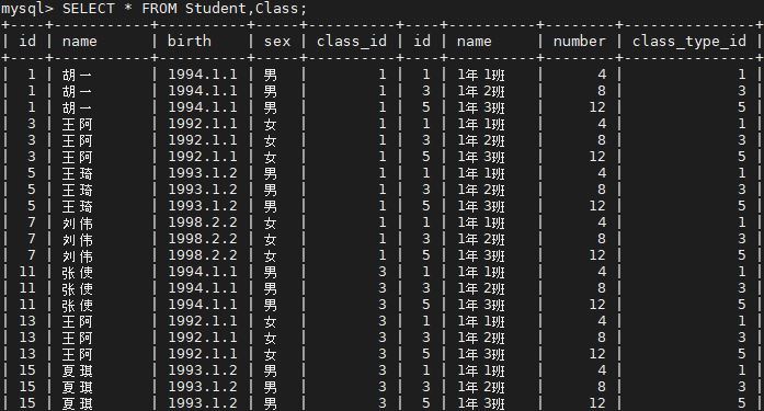SELECT * FROM Student as s, Class as c where s.class_id = c.id;
